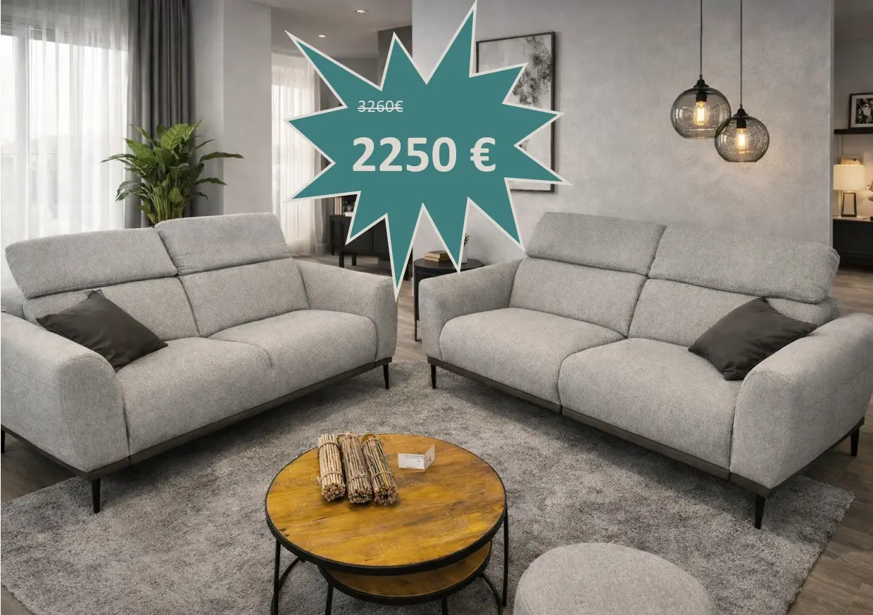 Salon Wallet en tissu gris composé d'un canapé 3 places avec 2 relax électriques et un canapé 2 places fixe au prix de 2250 € à la place de 3260 €
